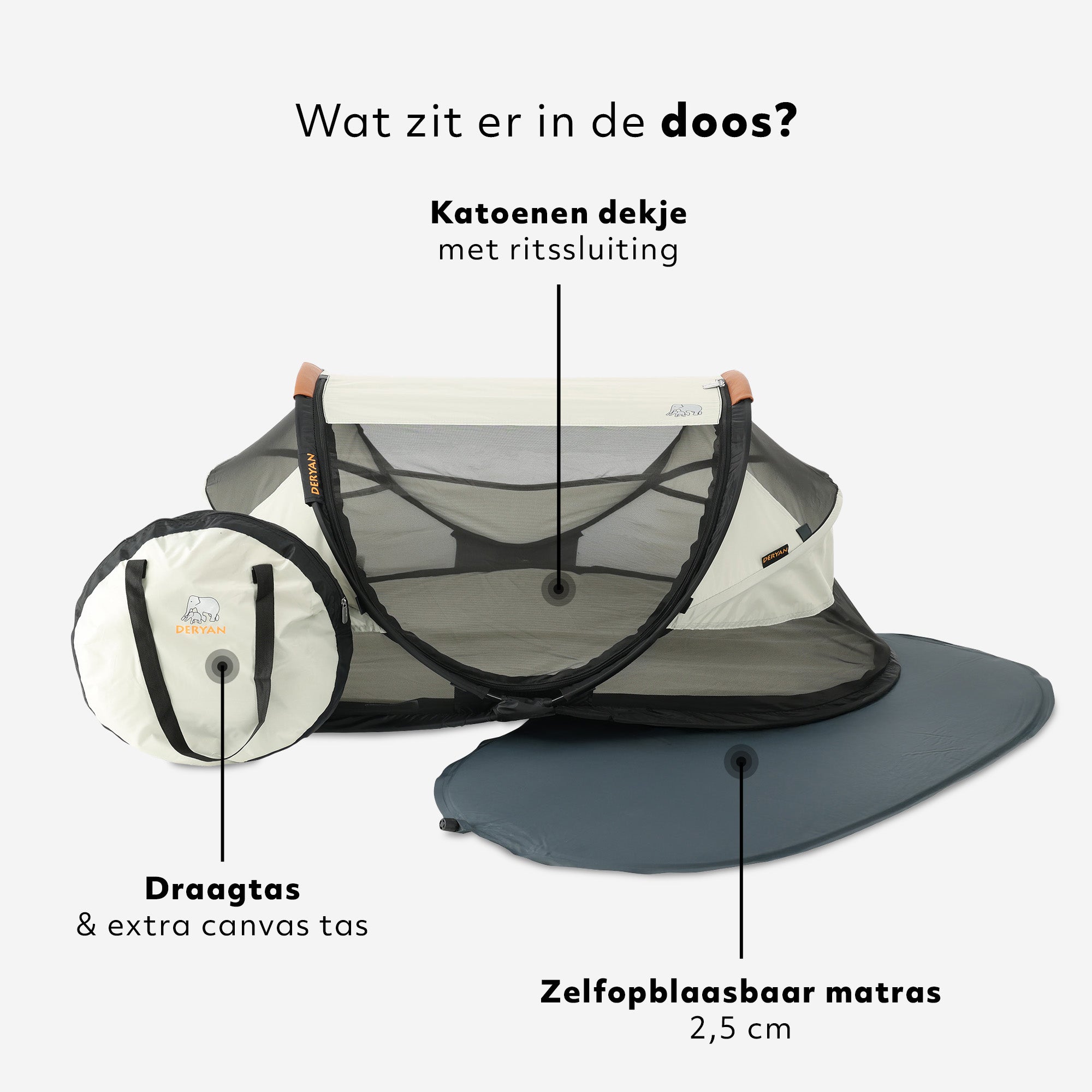 Ontdek de ultieme reisgenoot voor jou en je kleintje - de DERYAN Baby Luxe! Dit multifunctionele reisbedje wordt geleverd als een compleet pakket, inclusief een compact opvouwbaar bedje, een zelfopblaasbaar matras van 2,5 cm dik, een katoenen dekje met ritssluiting en een handige draagtas. Maar dat is nog niet alles - met de Baby Luxe zijn de mogelijkheden eindeloos! Of je nu op bezoek gaat bij familie, een dagje naar het strand gaat of zelfs een wereldreis maakt, met zijn lichte gewicht van slechts 1,8 kg neem je de Baby Luxe moeiteloos overal mee naartoe.